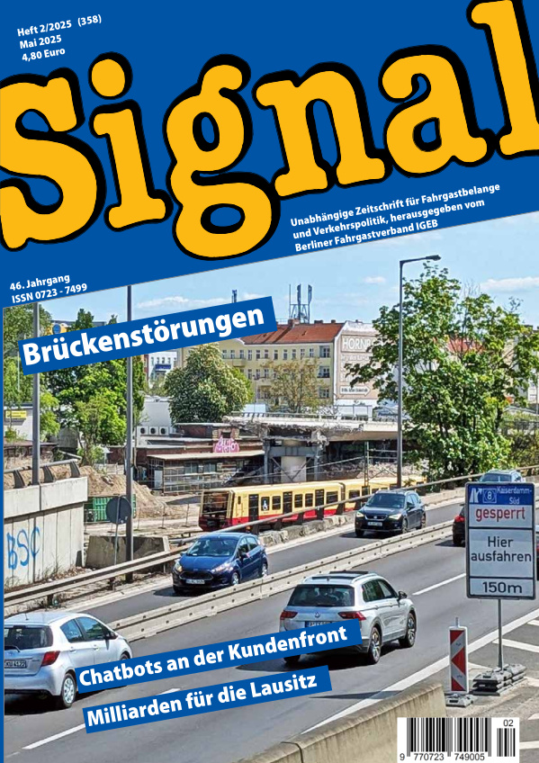 SIGNAL Mai 2025Einige wichtige Themen dieser Ausgabe: (Auszug aus dem Inhaltsverzeichnis)Wie die Autobahn die S‑Bahn lahmlegte. Und lahmlegen wird. (S. 04-05) >> alle Artikel anzeigen >>