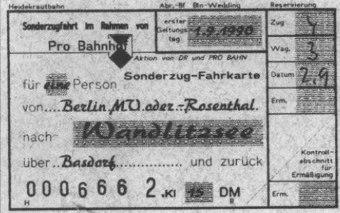 | Fahrkarte einer Heidekrautbahn-Sonderfahrt. Bald nach dem Mauer fall und noch vor der Wiedervereinigung wurden im Rahmen der 7. Berliner Schienenverkehrs-Wochen die ersten Sonderfahrten zum Grenzbahnhof