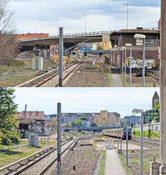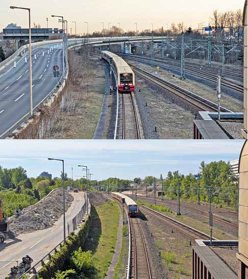 | Der eine Übeltäter, die „Ringbahnbrücke“ am S-Bahnhof Messe Nord, oben schon ohne Autoverkehr und noch mit S-Bahn-Verkehr unter der Brücke, unten nach dem Abriss und mit wieder aufgenommenem S-Bahn-Verkehr. Fotos: Florian Müller (20.3.25 und 29.4.25) |