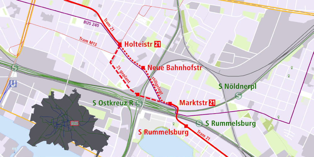 | Unterbrochen: Alte Strecke außer Betrieb, neue Strecke noch nicht gebaut. Die Linie 21 ist in der Boxhagener Straße stillgelegt, die Gleise werden aber noch für Betriebsfahrten genutzt. Grafik: Holger Mertens, Kartengrundlage: OSM |