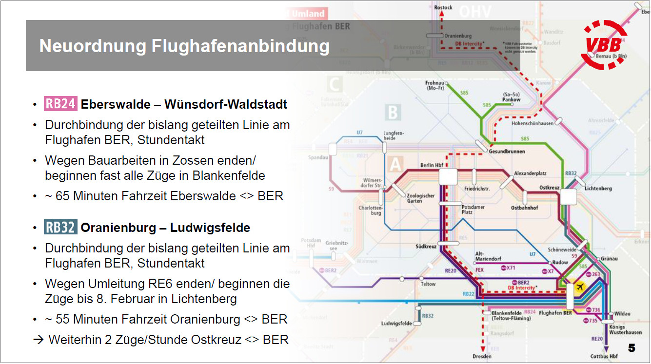 | Durch die Inbetriebnahme der Dresdener Bahn wird auch die Flughafen-BER-Anbindung neu geordnet. Mit dem FEX geht es alle Viertelstunde vom Hauptbahnhof über Südkreuz zum BER, zusätzlich stündlich mit der neuen Linie RE20 bis nach Lübbenau/Cottbus. Nauen, Falkensee, Spandau und Gesundbrunnen verlieren ihre umsteigefreie Regio-Verbindung zum BER. Der alte Regionalbahnhof Schönefeld wird gar nicht mehr regelmäßig bedient, nur noch per S-Bahn. Grafik: VBB |