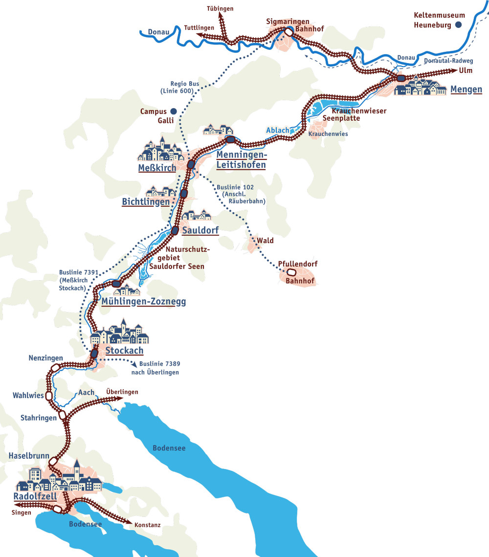 | Biberbahn am Bodensee.Die Gesamtstrecke der Ablachtalbahn ab Radolfzell ist 57 km lang; die aktuellen Reaktivierungspläne beziehen sich auf den nördlichen Teil Stockach—Mengen (39,5 km). Karte: Förderverein Ablachtalbahn e. V.; Ergänzung: IGEB |